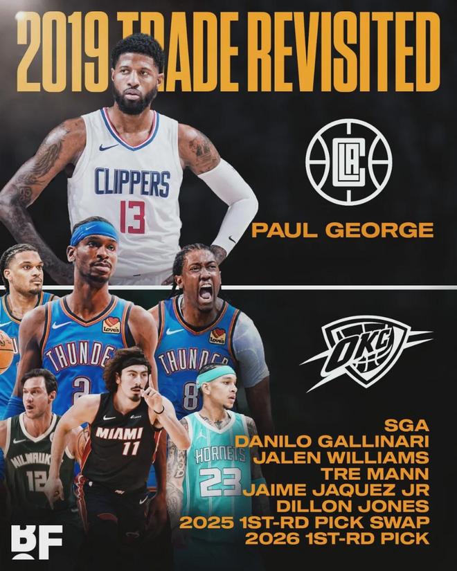 快船2026年首轮签啥时候送给雷霆的?这个选秀权来自乔治那笔1换9的大交易。当时快船送给雷霆5个首轮签(4个无保护,1个乐透保护),外加2个首轮互换权。雷霆用其中一个首轮签选中杰伦-威廉姆斯,而且明年有望冲击状元。