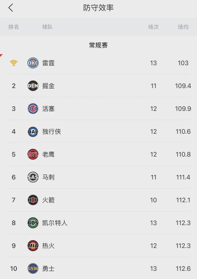 雷霆本赛季防守效率103,高居联盟第一;场均净胜对手15.5分,也是联盟第一;场均得分联盟第5,场均失分联盟第1;防守篮板、场均抢断和利用对方失误得分,均是联盟第1。这支雷霆攻防一体,防守更是断档式领先。